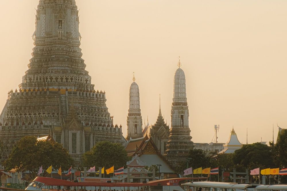 The famous Wat Arun temple rises majestically on the banks of the Chao Phraya and is bathed in warm, golden light. The ornately decorated towers and magnificent prangs reflect the elaborate architecture and spiritual energy of Thai temple art. In the foreground, colourful boats with fluttering flags glide across the water, underlining the lively hustle and bustle on the river. The scene combines history, religion and everyday life and creates a real sense of wanderlust with its harmonious colours and fine details. The picture appeals to lovers of Asian culture, wanderlust, architecture and tradition and is perfect as a decorative highlight in modern living spaces or elegant offices. The composition brings the beauty of Bangkok and the special atmosphere of a sunset directly into your own home and makes an exotic statement.