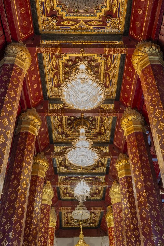 An elaborate coffered ceiling spreads out above the statue, enveloping the room in fine geometric structures and colours. The elaborate patterns and decorations on the ceiling bear witness to the deep reverence and respect that people have for the Buddha. The entire room is imbued with a quiet reverence and spiritual power.