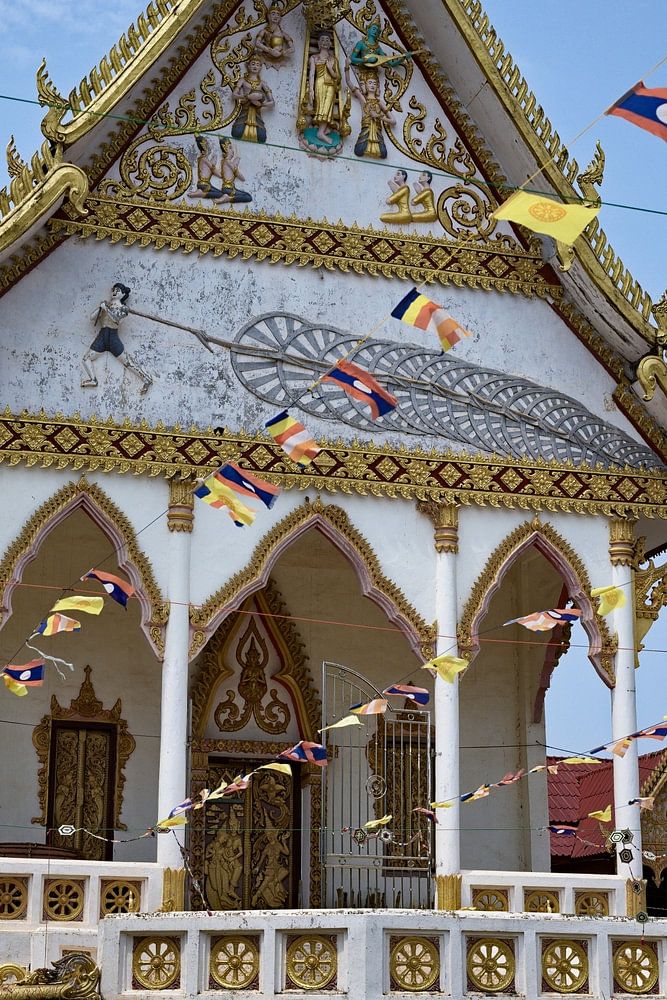 Wat PhonKoung, located in Pakse in the south of Laos, reveals an atmosphere of contemplation and serenity. In April 2025, under a peaceful, luminous sky, a row of white and gold stupas stands between palm trees, in the middle of a carefully tended sacred space. These stupas, typical funerary monuments of Theravāda Buddhism, symbolise the link between the living and their ancestors, between the ephemeral and the eternal. Garlands of brightly coloured pennants float above the site, adding a festive and spiritual touch to this place dedicated to remembrance. Each finely-decorated stupa is the bearer of an individual story, a personal tribute, in a collective setting imbued with respect and silence. The harmony between the surrounding nature, the sacred structures and the ritual decorations creates a unique atmosphere, typical of Laotian temples. This place invites contemplation, respect for Buddhist traditions and deep spiritual reconnection. To visit Wat PhonKoung is to immerse yourself in an essential part of Laotian culture, at the crossroads of art, faith and memory.