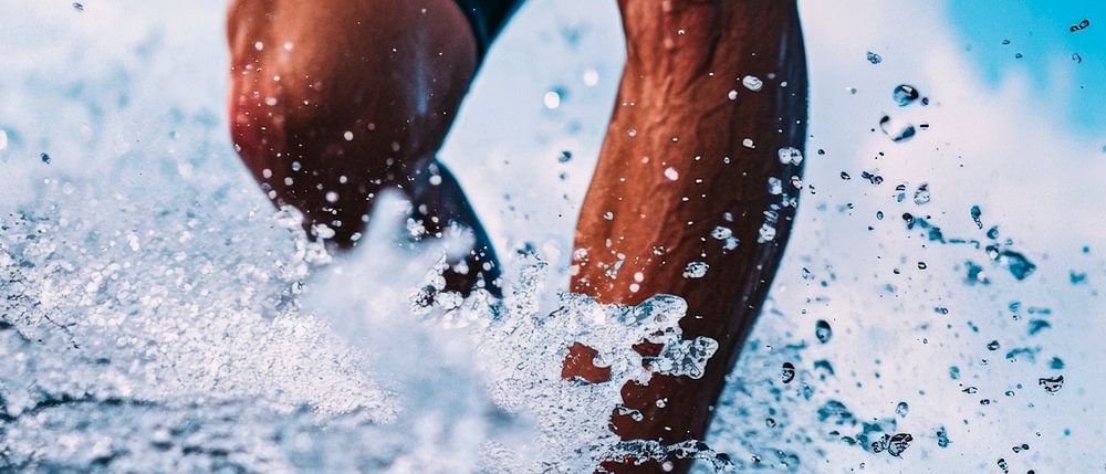 Lively waves play around strong legs while the sun shines in the background. This dynamic motif radiates freedom and a sense of adventure, ideal for a living room to bring a holiday feeling and a touch of the sea into the home. The contrast between the bright blue sky and the water creates an inviting atmosphere.