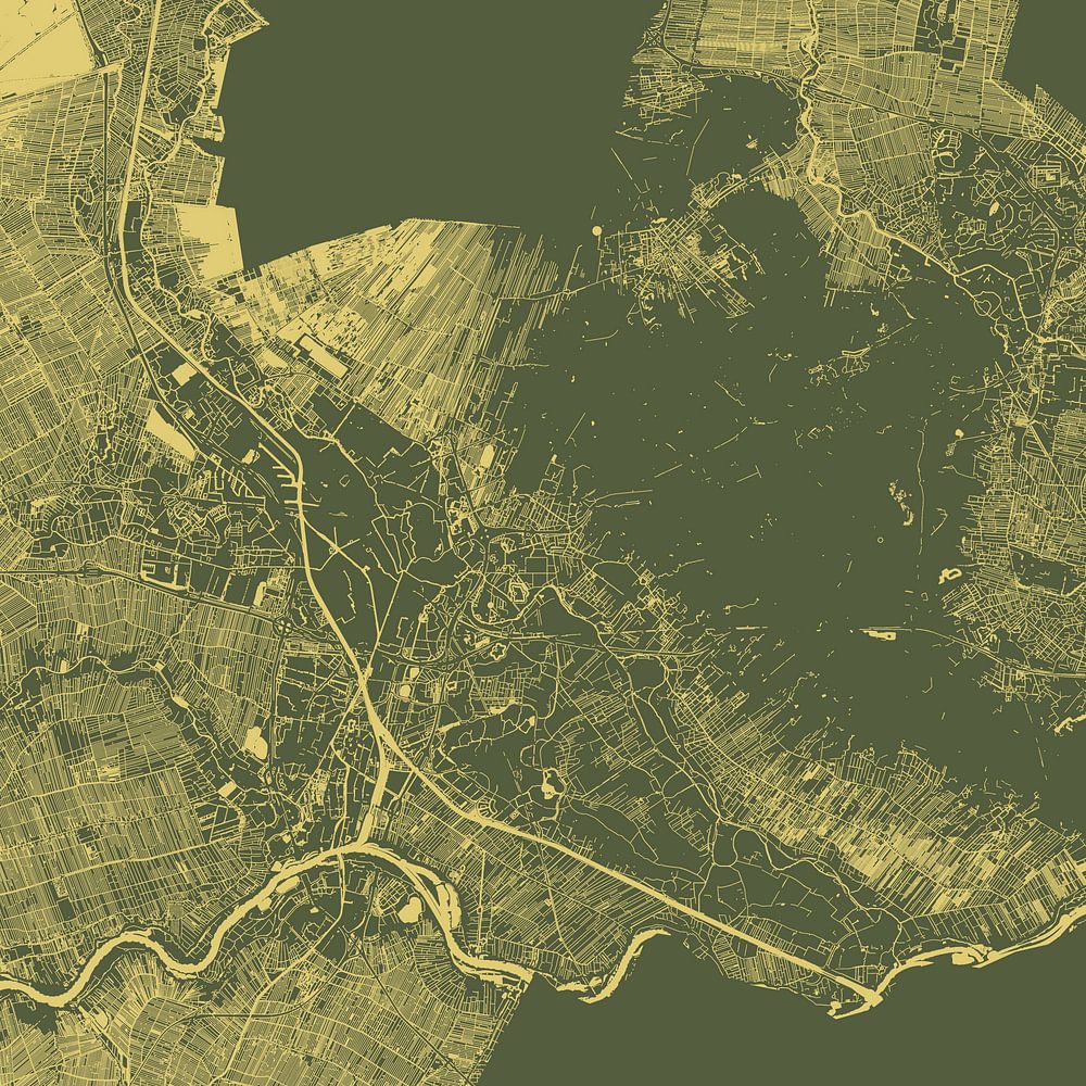 All lakes, rivers, canals, streams, ditches and other watercourses of the province of xx are depicted on this high detail yet minimalist map. This is why it is not a country map but a water map. One of the nice things about this type of map is that by showing only the water, other objects on land automatically come to the fore, such as forests, towns and polders. The background is olive green and the water is straw yellow, also known as 'harvest gold'. The contrast with the green background gives the dull yellow a golden glow. This artwork is suitable for interiors with earthy colours. It goes well with indoor plants and/or plant motifs.