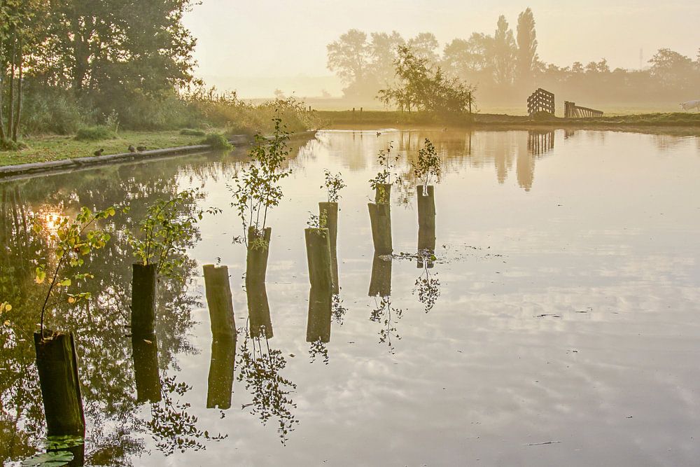 Het 'zwembad' in Sassenheim in de vroege morgen met de spiegeling in het water, de opkomende zon en de mist maakt het tot een sfeervol plaatje. De koeien en de hekken maken het af.