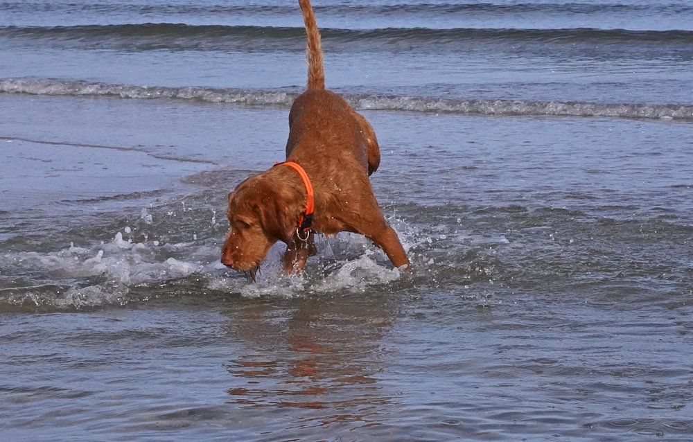About "Water games at the Baltic Sea with a Magyar Vizsla."