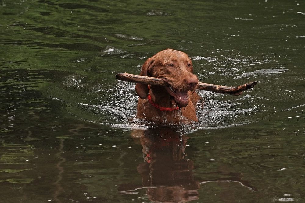 Water games at the lake with a brown Magyar Vizsla wirehair.