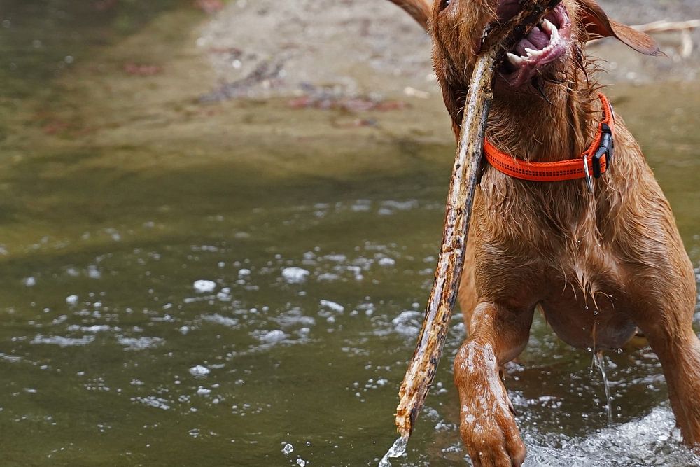 About "Water games at the lake with a brown Magyar Vizsla wirehair."