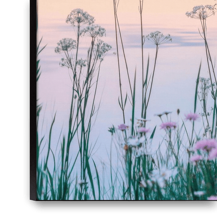 The horizon shimmers in soft pastel colours while delicate flowers dance in the dusk. The calm waters reflect the colours of the sky and the gentle waves tell of a peaceful summer evening. A moment of pure idyll, where nature and tranquillity merge harmoniously.