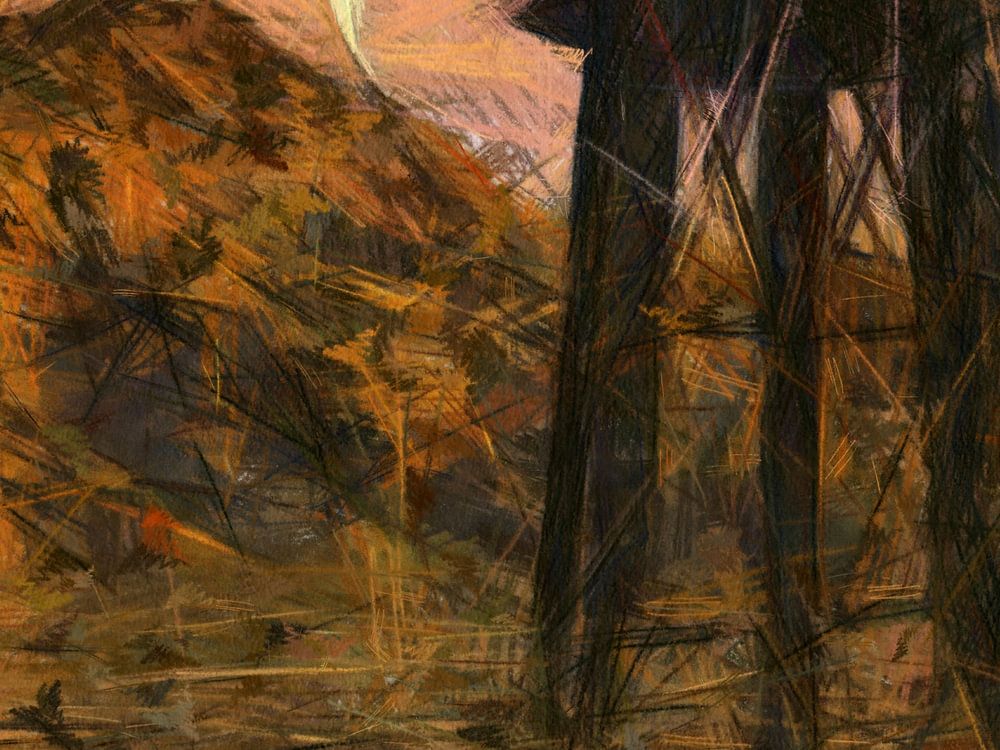 The picture shows a water tower at sunset or sunrise, depicted in an expressionist or impressionist style.