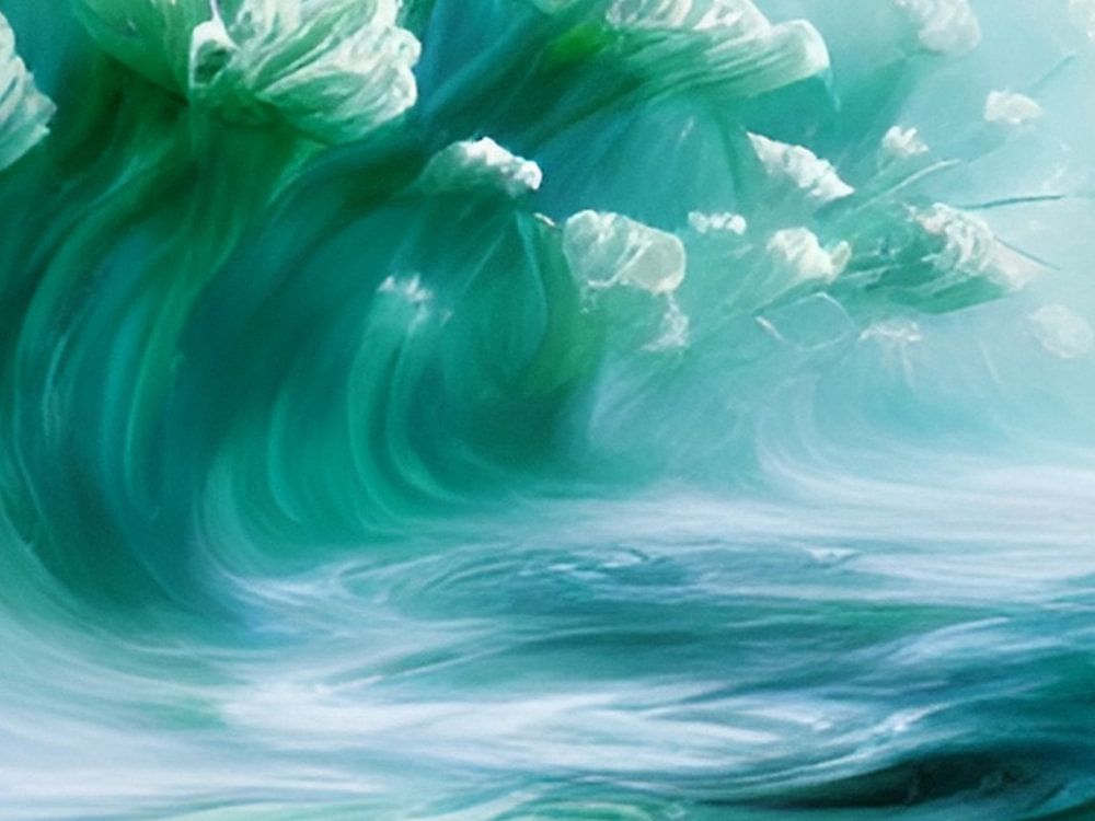 Digital painting of a wave composed of light-coloured flowers above the surface of the water.