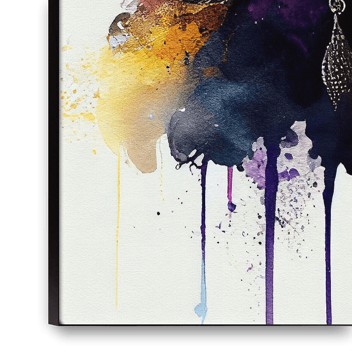 A poised woman turns in three quarter profile, her face partly hidden behind a dark lace carnival mask. Feathers in warm gold and soft brown arc from her temple, catching the light against a halo of deep violet and indigo washes. The background dissolves into flowing watercolor splashes with hints of magenta and yellow, while a band of…