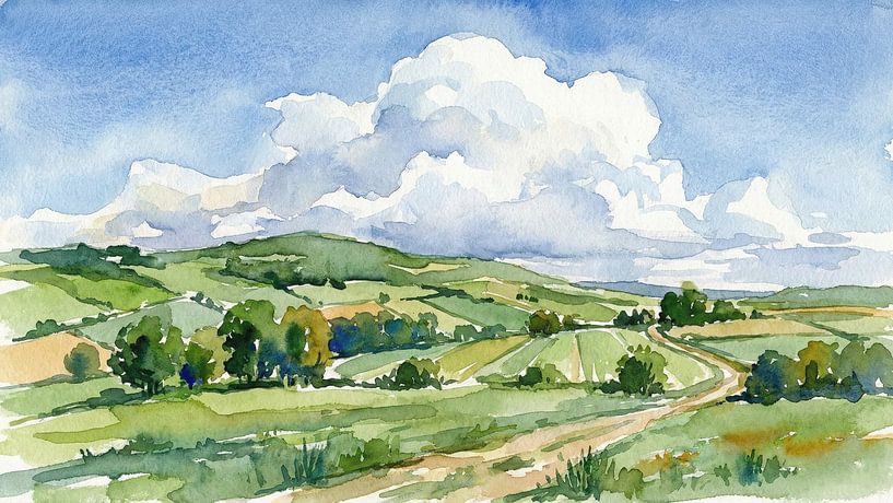 Watercolor painting of a rural landscape with rolling green hills, fields, trees, a dirt road, and a blue sky with fluffy white clouds.