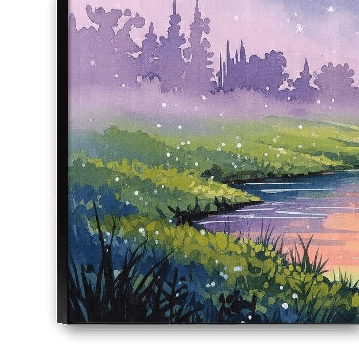 Watercolor landscape with river, boat, figure, large tree, distant castle, and pastel sky. Sparkles and light rays add to the whimsical feel.