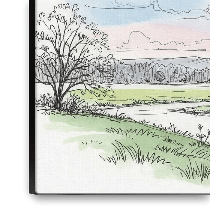 Watercolor & ink landscape of a winding river through a grassy field, backed by mountains & forest, under a sky with clouds.