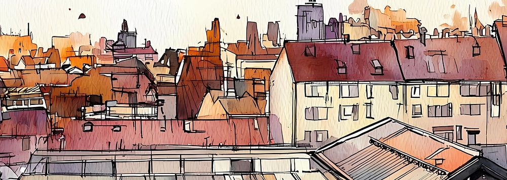 Watercolor panorama from a sketch album, views of the city from the rooftops