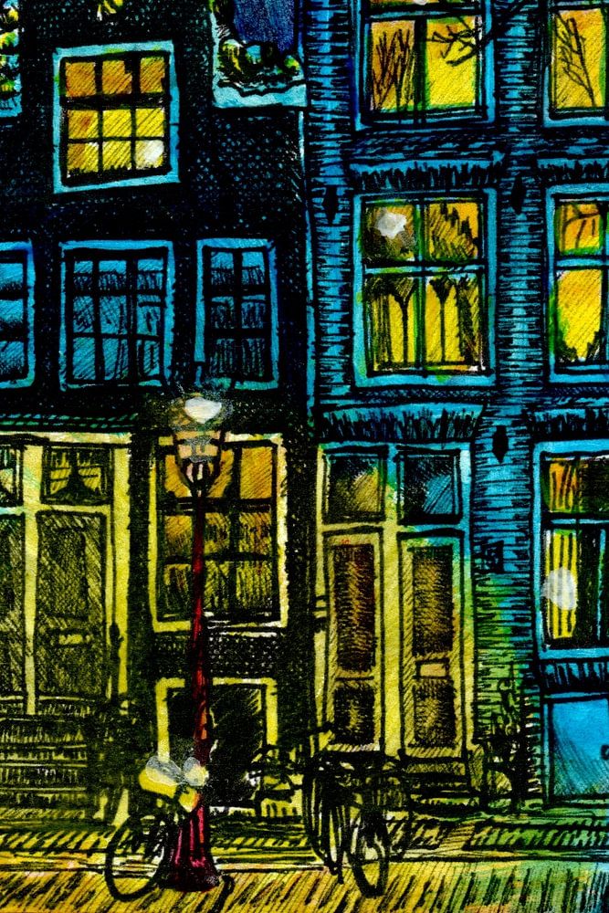 A Watercolour Painting of the Groenburgwal Houses during the Blue Hour in Amsterdam Netherlands.