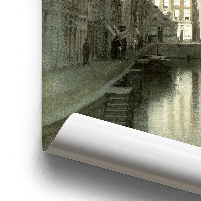 A watercolour by painter Johannes Klinkenberg made around 1880. A peaceful scene with a moored boat, some warehouses, people on the quay and a late sun reflecting off the illuminated houses in the bare water of the canal. The splendour of old Rotterdam city centre before the Second World War.