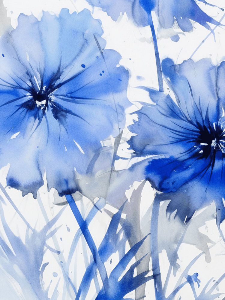 Delicate cornflowers in various shades of bright blue unfurl their filigree petals on a light background. The watercolours gently flow into one another and create an impressionistic impression of lightness and transparency. Fine stems and hints of leaves complement the floral shapes. Splashes of colour and subtle transitions lend the picture a lively and dynamic quality. The composition poetically captures the delicate beauty and airy elegance of these summer wildflowers.