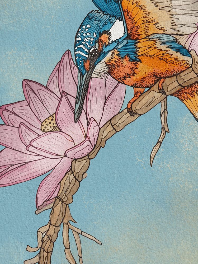 Buy this flower art Watercolour kingfisher with water lilies by Marjolein Fortuin on canvas, ArtFrame, poster and wallpaper, printed on demand in high quality.