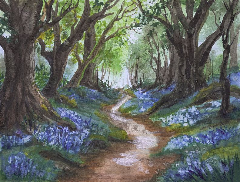 A watercolour painting of a woodland landscape in spring. The ground is strewn with wild hyacinths blooming amongst the large, ancient trees.