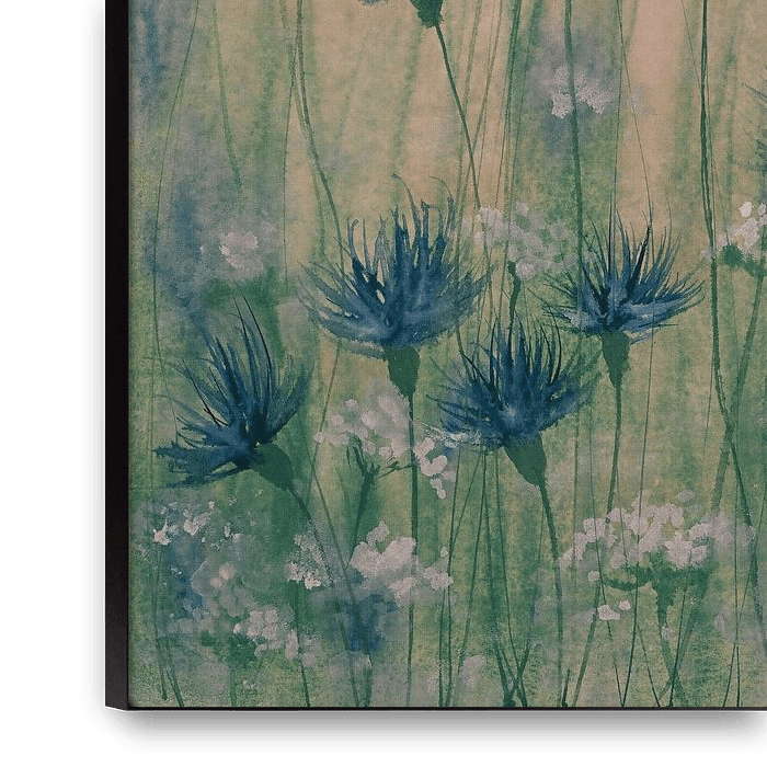 Watercolour or watercolour painting of a summer meadow with cornflowers and wild carrots. The colours used are soft pastels.