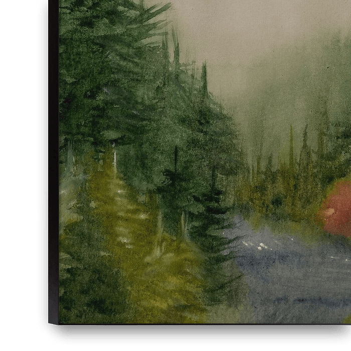 Watercolour or watercolour painting of a mountain landscape with a stream and large conifers disappearing into the mist.