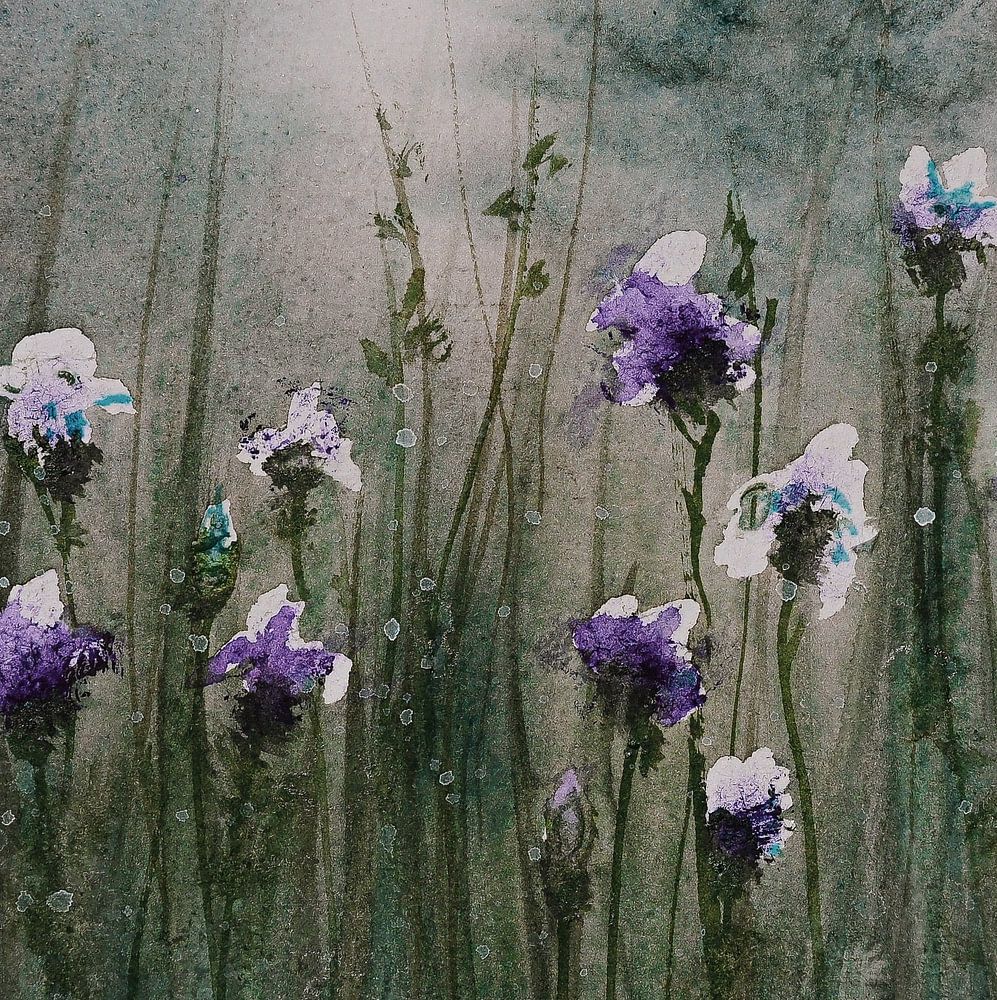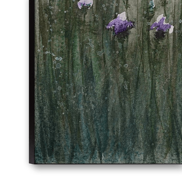Watercolour or watercolour painting of a meadow with irises among the tall grass and hazy pines in the background. The painting is atmospheric.