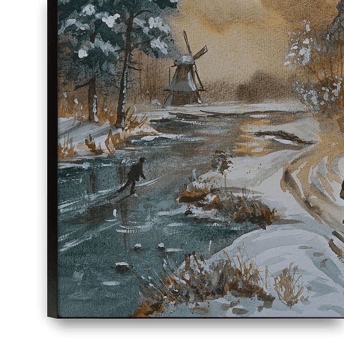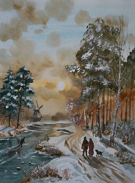 Watercolour or watercolour painting of a winter landscape with a river and a footpath along it. The river is frozen and someone is skating. On the footpath, two people walk their dogs. The sun is rising.