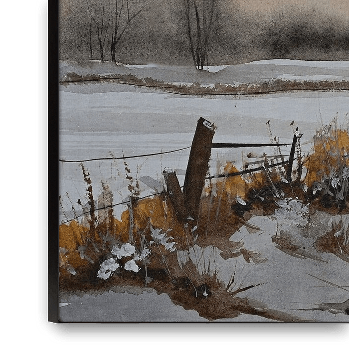Watercolour painting of a winter landscape. You can see a footpath, with a small house and a fence alongside it. The sun is rising and the sky is displaying the most beautiful colours.