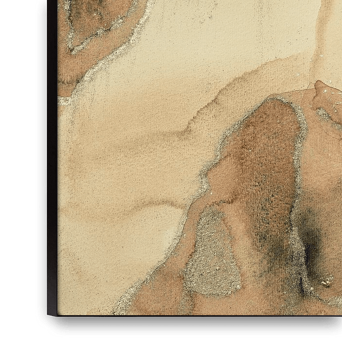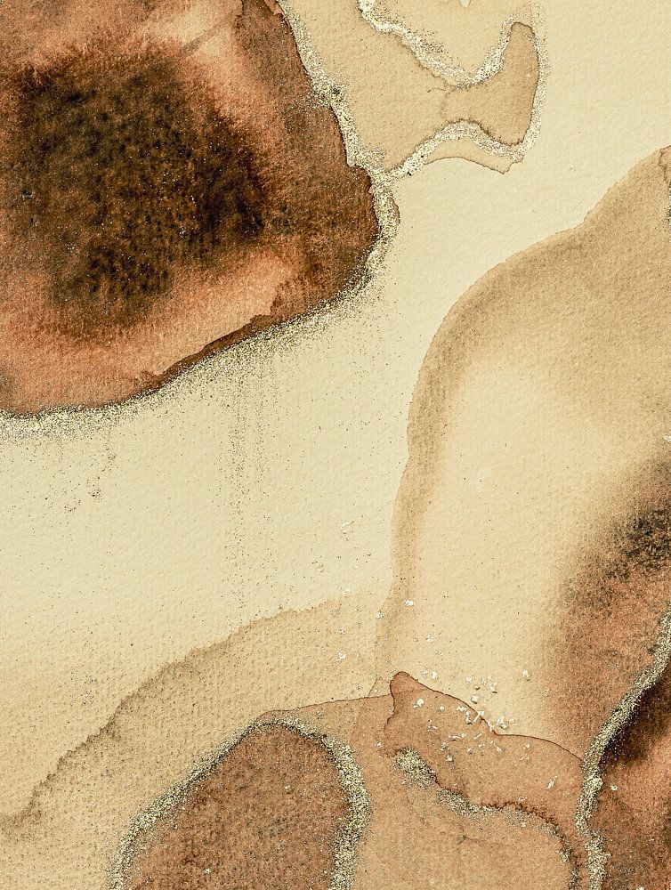 Abstract watercolour painting. You see irregular brown circles on a beige background. The edges of the circles are sprinkled with gold dust.