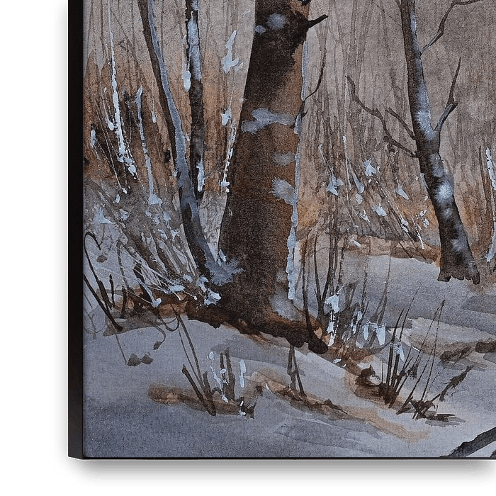 Watercolour painting of a winter landscape. You can see a footpath in the snow-covered forest during a beautiful sunrise. The sun casts a warm light into the forest.