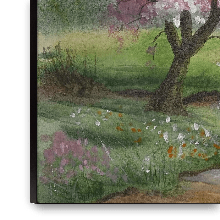 Watercolour painting of a spring landscape with a footpath between meadows with trees, and a large blossoming tree along the path. Small flowers grow in the grass and there is some ground fog in the distance.
