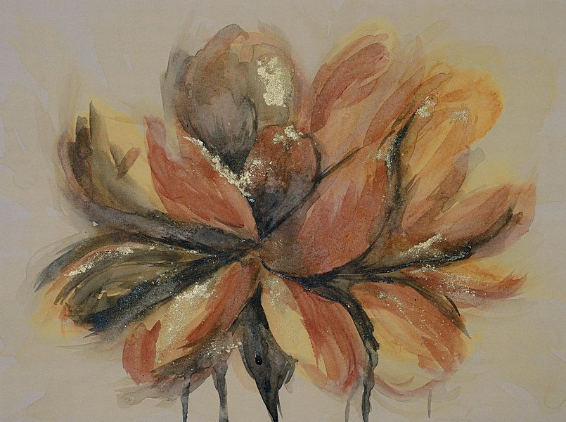 Watercolour painting of an abstract flower. The colours are warm, brown and golden hues.