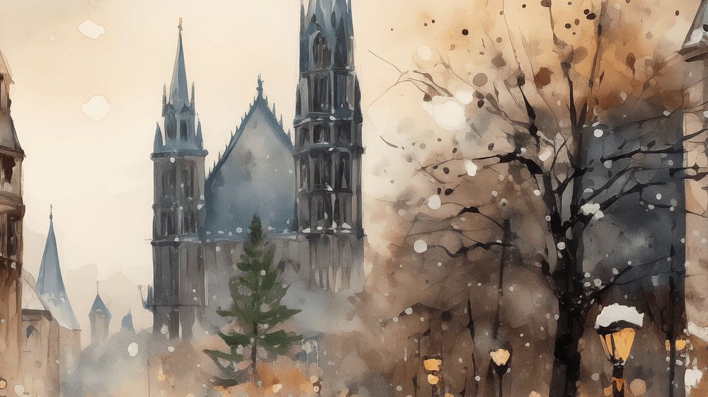 About "Watercolour shopping at the Christmas market with lights and bokeh painting in the city Winter Art Design"