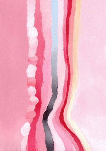 A watercolour painting with an abstract pink background and thin vertical stripes in red, white, pink, light blue, yellow and grey. The stripes are reminiscent of the outlines of human legs and create depth and visual interest. Pastel-coloured, soft tones, minimalist and harmonious, create a warm, elegant atmosphere. The composition is modern, decorative and striking, ideal for abstract illustrations.