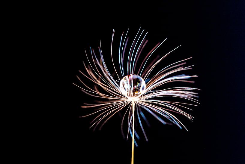 Macro fotografie .waterdruppel op een paardenbloem pluisje