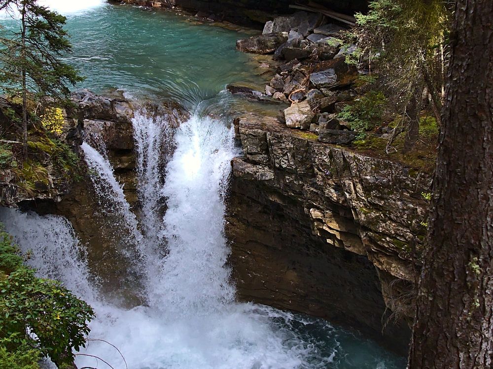 Idyllic landscape shot of waterfalls in the famous Johnston Canyon in Banff National Park, Canada in the Rocky Mountains with blue shimmering milky water surrounded by rugged rocks and the trunks of two conifers in the foreground in autumn.
