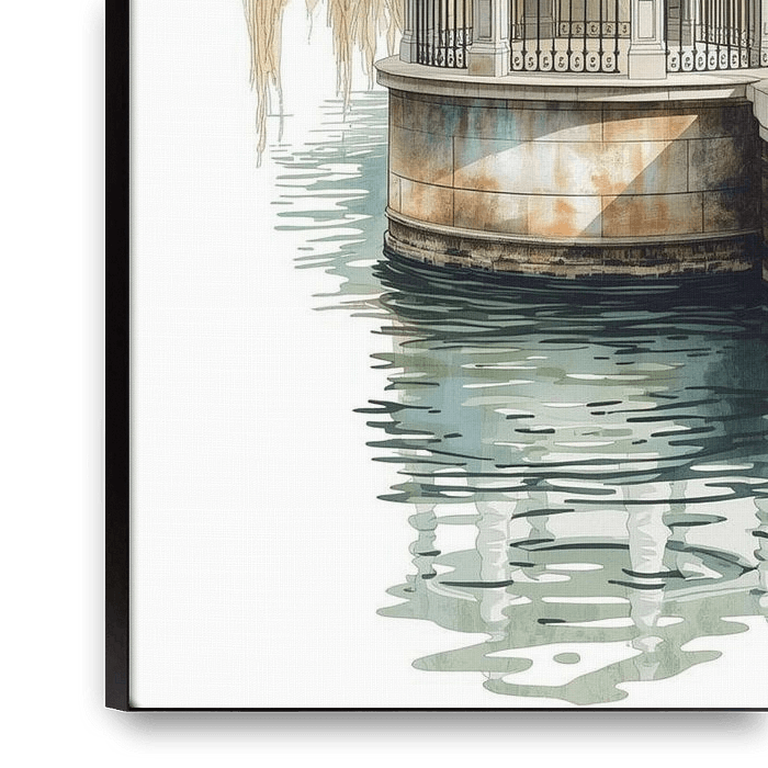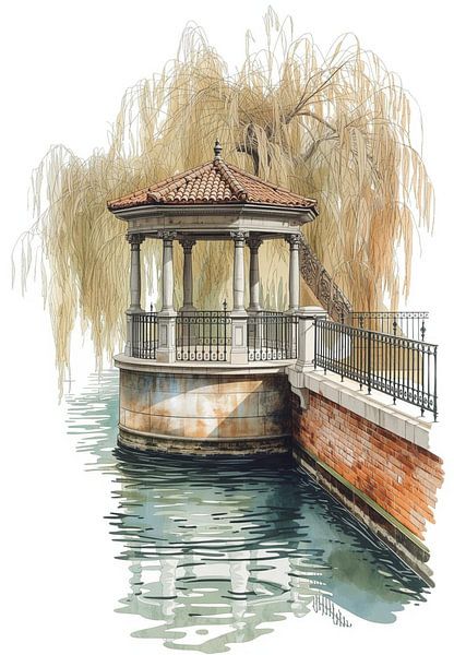 Buy this digital art artwork Waterside Rotunda. Weeping Willow Calm by Sergej Gello as a reproduction on canvas, ArtFrame, poster and wallpaper, printed on demand in high quality.
