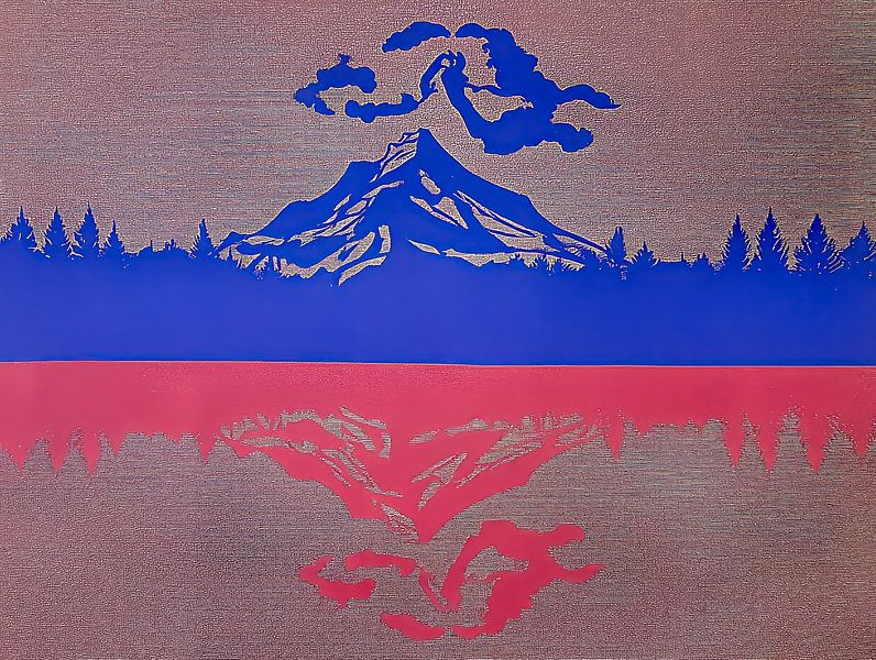This landscape shows a mountain rising behind a dark forest edge, reflected in a calm lake. The horizontal structure gives the image a calm, stable look. The texture adds an artisanal feel to the graphic style.