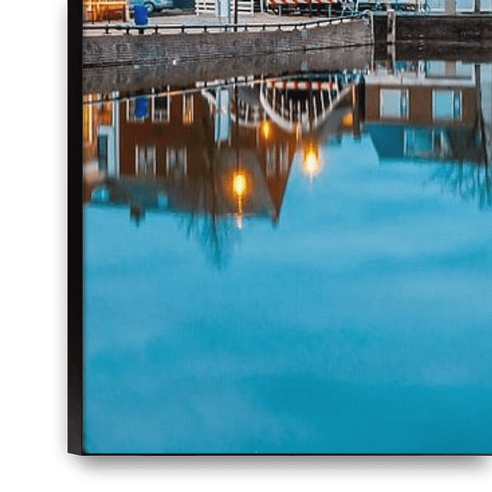 Panoramic view across the Kolk towards Sneek's watergate during the blue hour. Almost no wind and therefore a beautiful reflection in the water.
