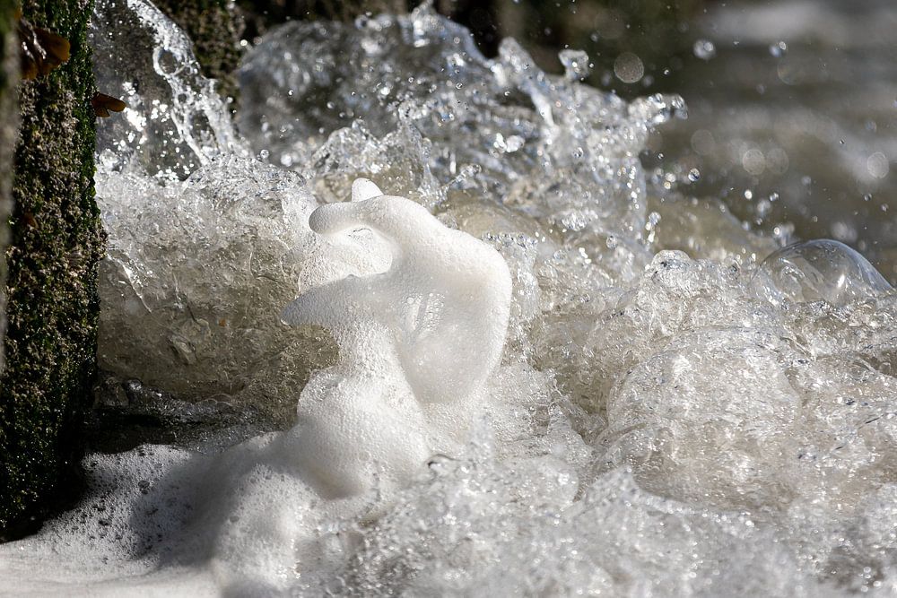 A wave breaks on the groynes on the beach near Zeeuws-Vlaanderen in the beautiful morning light