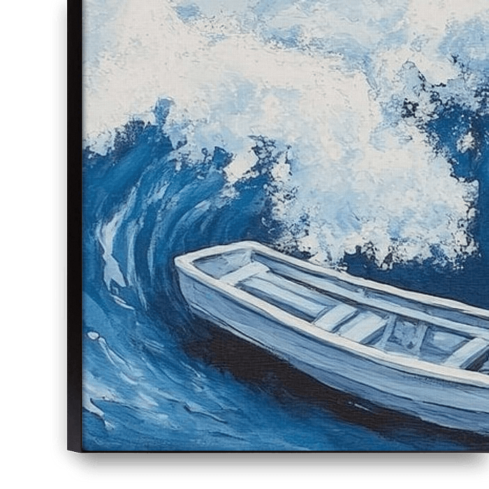The dynamic waves crash powerfully against the boats, while the majestic mountain rises in the background. The soft blue tones lend the room a calming atmosphere and evoke maritime memories. Ideal for the living room, this artwork creates a perfect focal point that stimulates the imagination and awakens the longing for adventures on the…