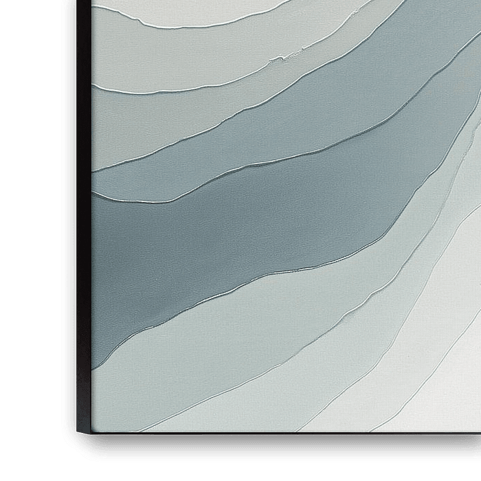 Minimalist and serene composition built from undulating layers that rhythmically overlap. The colours progress from bright whites and soft greys to deeper greens, creating a sense of depth and movement. The flowing lines are reminiscent of landscape contours - such as hills, mountains or waves - but remain abstract enough to leave room for personal interpretation.