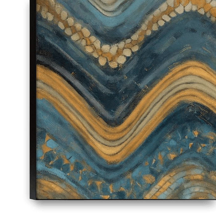 This work shows an undulating pattern with shades of blue and gold. The lines vary in thickness and colour, creating a rhythmic movement that guides the eye through the design. The use of blue and gold adds a soothing yet luxurious feel to the work.