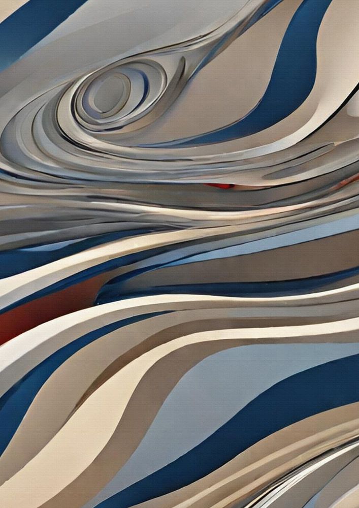 This work shows flowing, metallic waves that appear to be intertwined. The shades of blue, grey and white create a sense of depth and movement, with touches of orange here and there to provide contrast. The undulating lines and layers give the work a dynamic feel, as if the steel itself is coming to life.