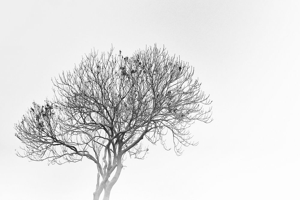 This beautiful tree in the winter misty landscape formed by weather and wind is in West Zeeland Flanders. A minimalist black and white photograph due to the ground fog and snow present.