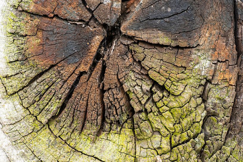Weathered wood. It is part of an old fence along a path. Found along the creek De Markgraven near Almelo. The colours on the weathered wood are caused by lichens.