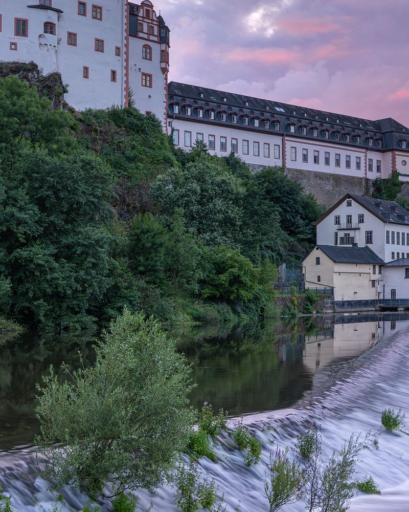 Panoramic view of the Schlossberg of Weilburg at dusk, Lahn Valley in Hesse, Germany