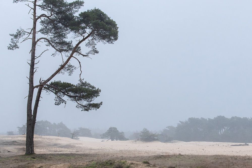 Sfeervolle impressie op het Wekeromse Zand op de Veluwe in de ochtend. Op de achtergrond nog een beetje ochtendmist, waardoor de boom goed naar voren komt.