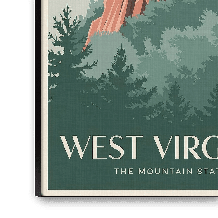 Majestic cliffs rise above a gentle, wooded landscape that shimmers in soft shades of green. This artistic depiction of West Virginia evokes a sense of adventure and closeness to nature. Perfect for the living room, it brings a touch of nature and relaxing tranquillity to the room - ideal for creative thoughts and stimulating conversation.