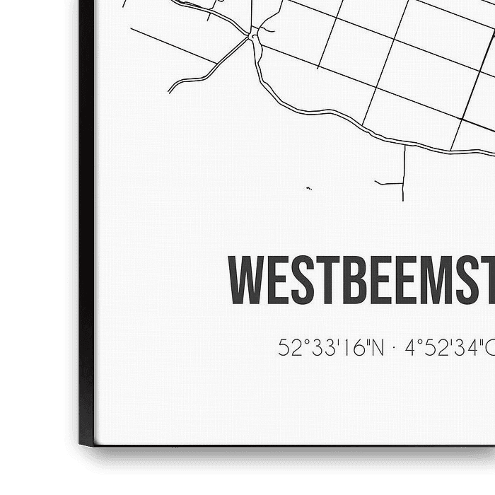 Black and white map, street map or street plan of Westbeemster. Westbeemster is located in the municipality of Beemster, province of North Holland. On the city map all public roads in Westbeemster are included. Furthermore, the map is provided with the coordinates of the center of Westbeemster.