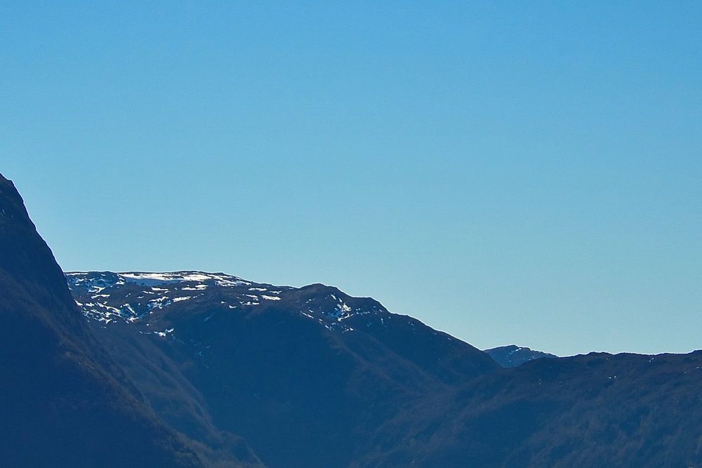 Western Cape in Norway. Fjord and sea with mountains on the coast. No clouds blue sky. Rough nature in Scandinavia